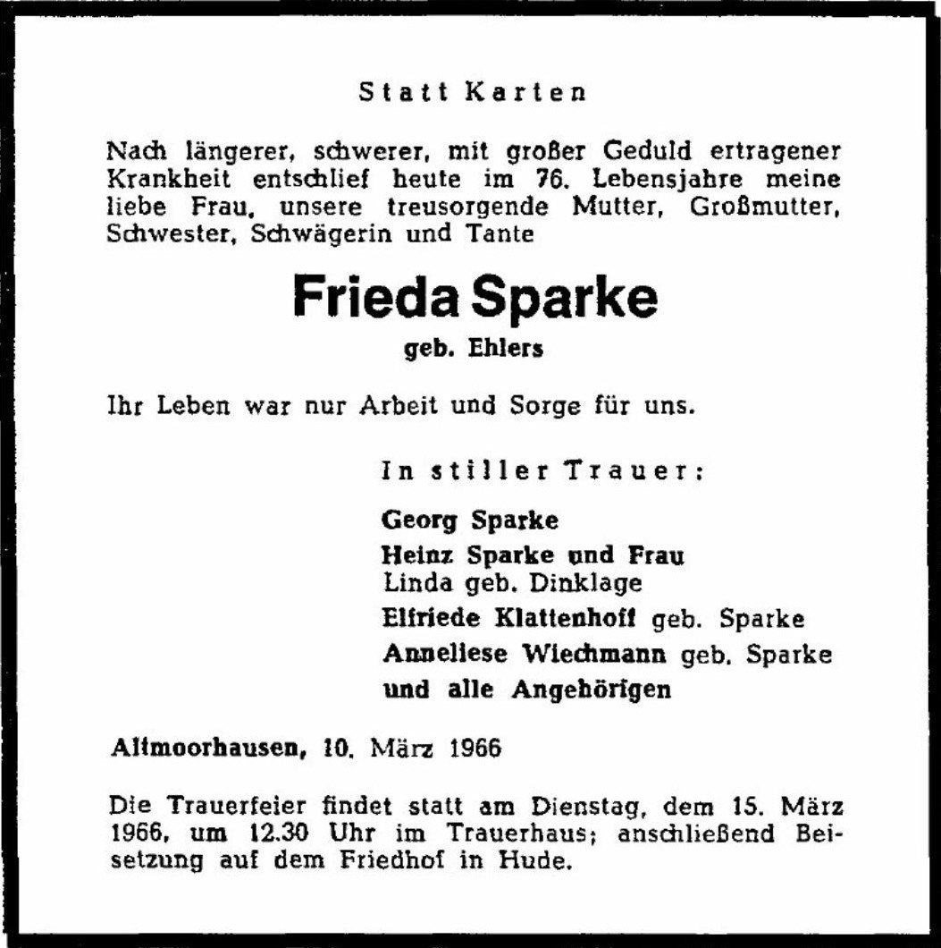 Frieda Sparke – Traueranzeige