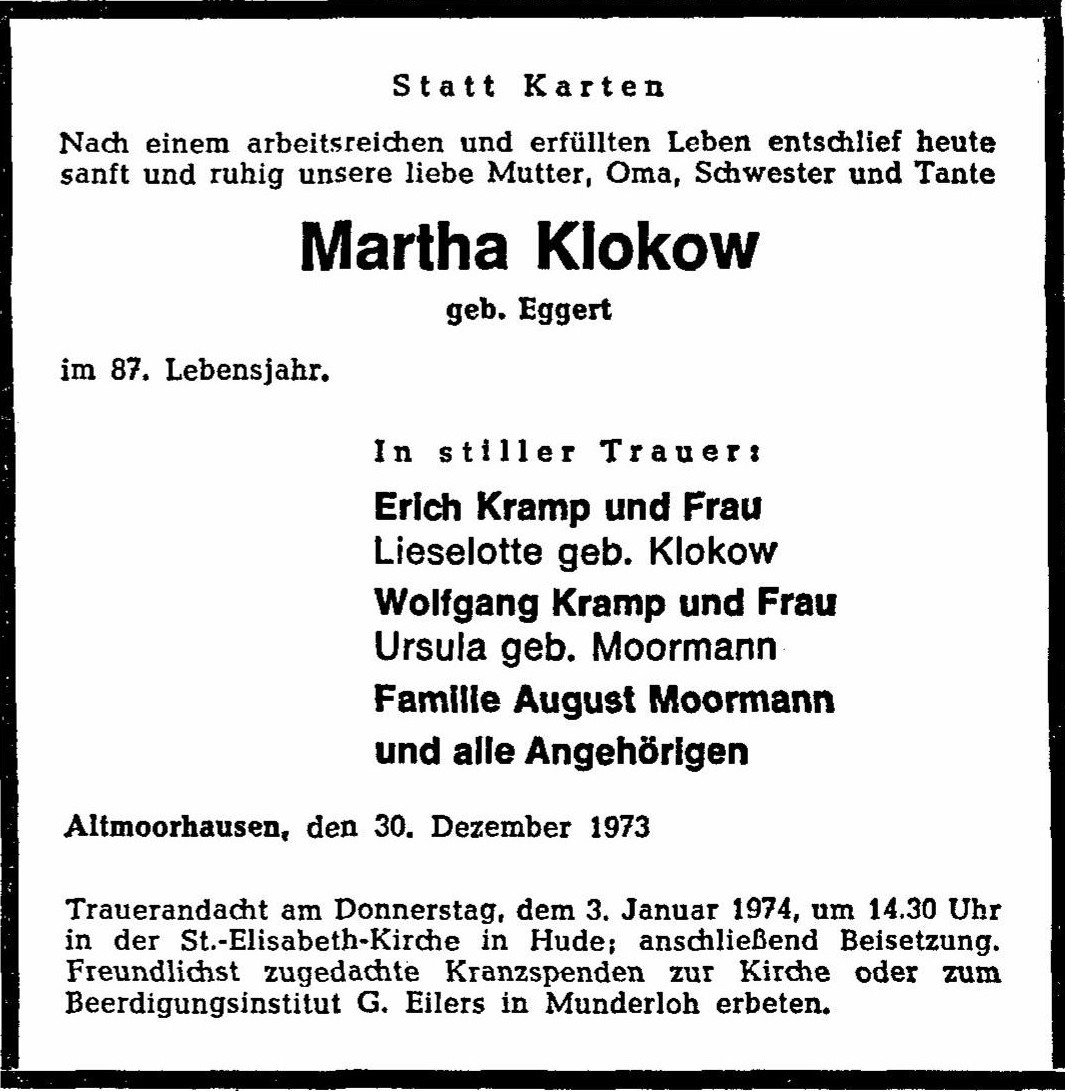 Martha Klokow – Traueranzeige